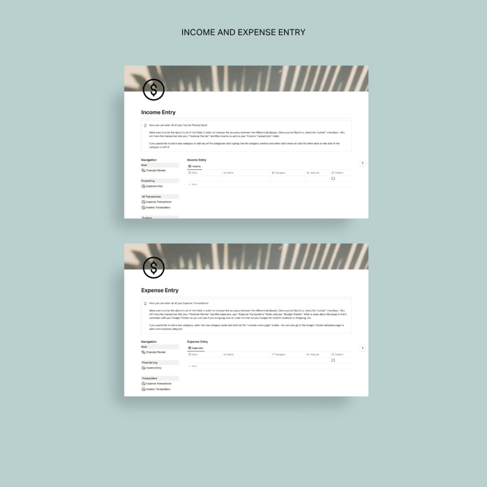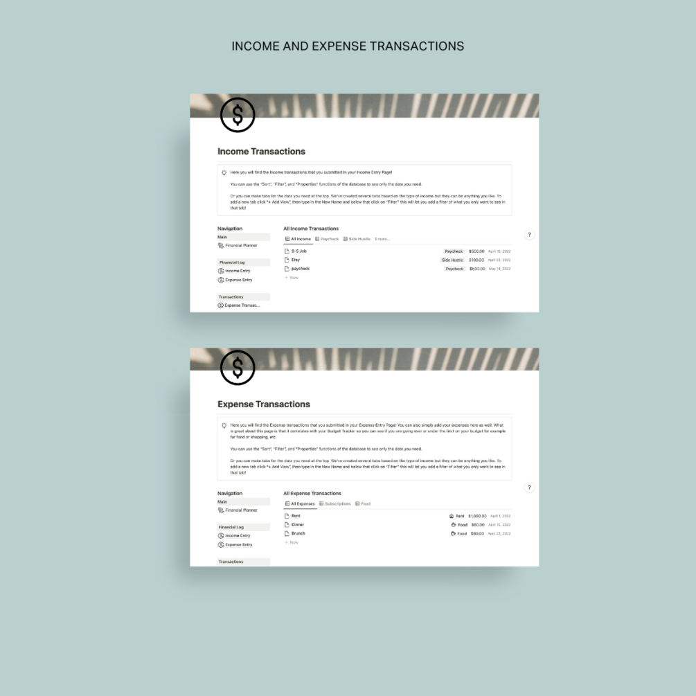 Pages for income transactions, expense transactions, savings trackers, budget trackers, bills trackers and a wish list!